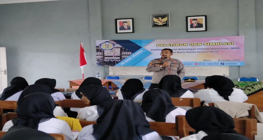 Kapolsek Kunduran Iptu Kumaidi menyampaikan materi tentang persyaratan pembuatan SKCK kepada peserta didik SMK Negeri 1 Kunduran pada Rabu, 7 Desember 2022.